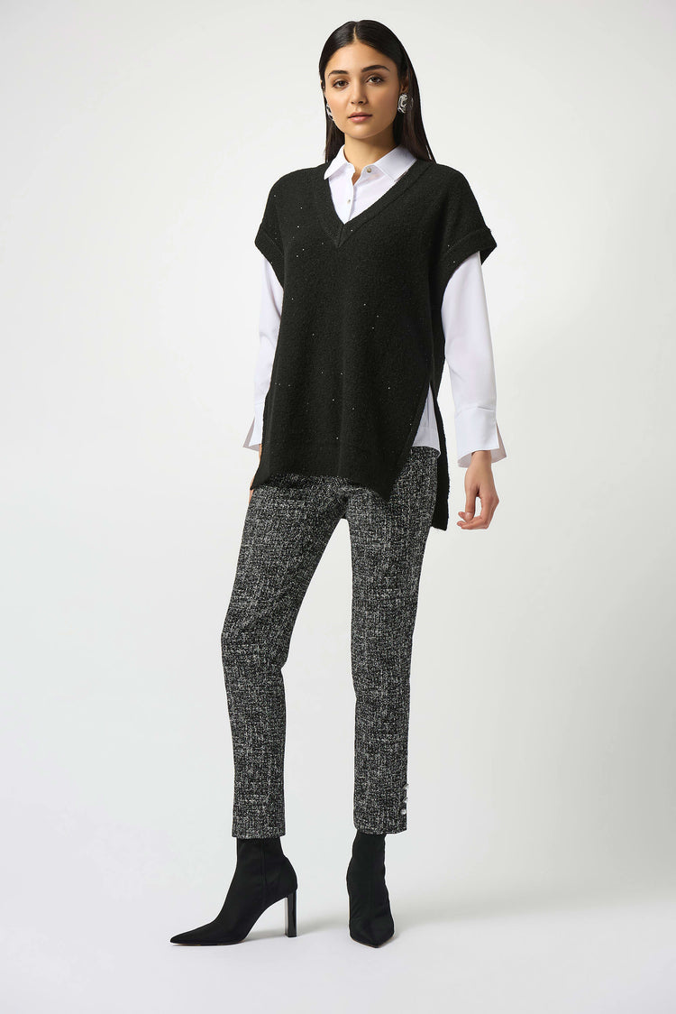 Elevate your style with the Sweater Knit Sleeveless Tunic by Joseph Ribkoff, featuring eye-catching sequin embellishments. This chic tunic is crafted from soft sweater knit fabric, offering a relaxed fit and comfortable wear. The sleeveless design and sequin detailing make it perfect for layering or wearing solo during transitional seasons. With its versatile length and sparkling accents, this tunic is ideal for both casual outings and dressier occasions.